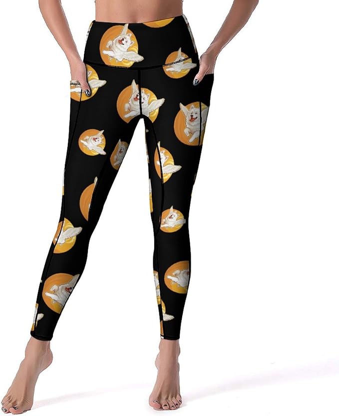 American Eskimo Dog Running Angel Wings Women's Leggings with Pockets High Waist Tummy Control Yoga Pants for Workout