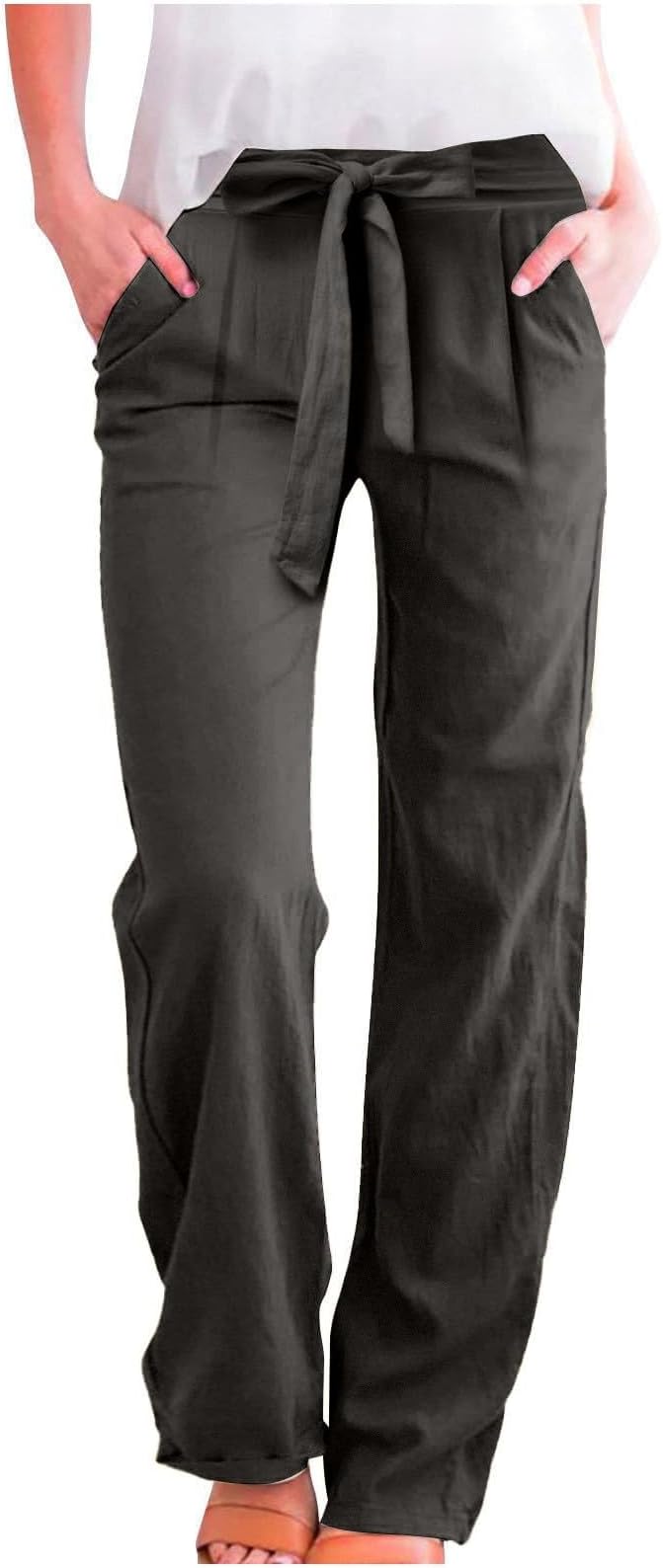 Linen Pants Women High Waisted Straight Leg Casual Work Pants with Pockets Pull On Elastic Waist Pants Trousers