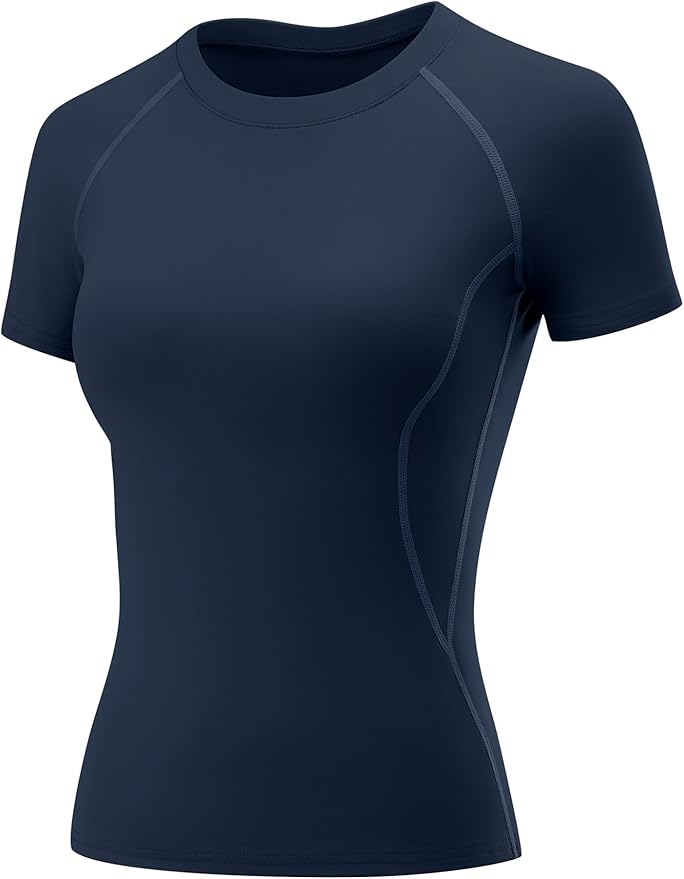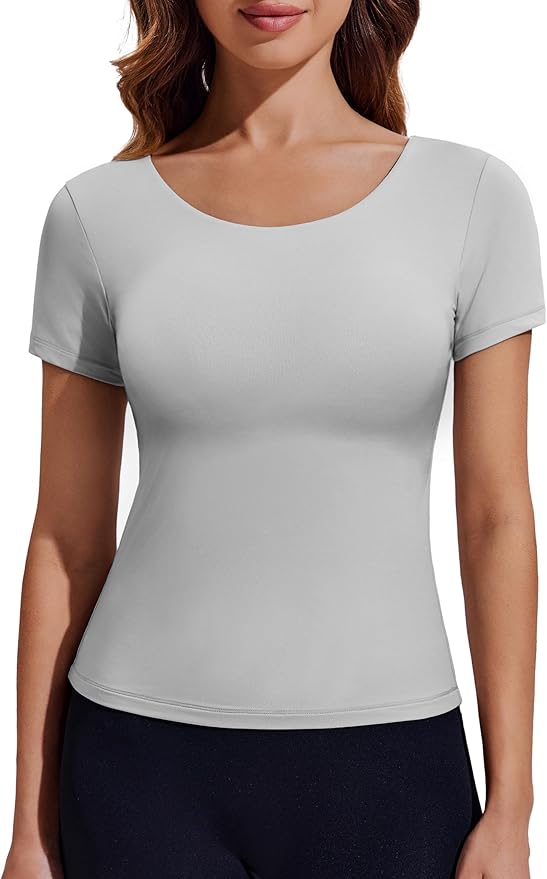 Workout Tops for Women Double Lined Crew Neck Athletic T-Shirts Short Sleeve Tight Basic Tee for Yoga Gym Casual