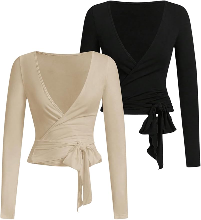Women's 2 Pack Yoga Shirts Wrap Ruched Tie Front Long Sleeve Workout T Shirts