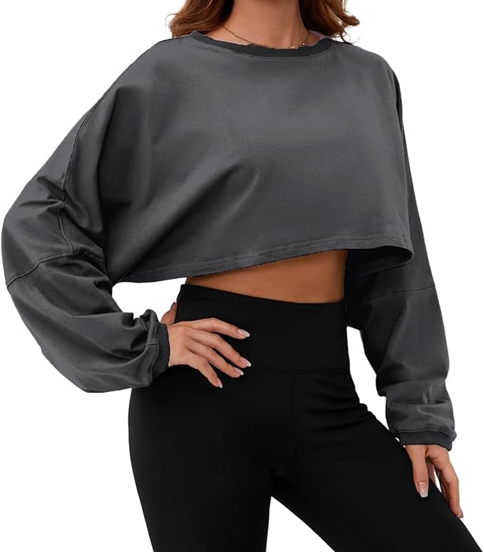 Oversized Long Sleeve Cropped T Shirts for Women Loose Fit Workout Gym Crewneck Crop Tops Tee Sweatshirts Pullover